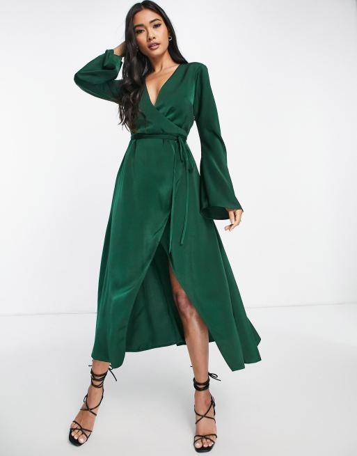 Asos Design Bias Cut Satin Wrap Dress With Tie Waist In Forest Green Asos